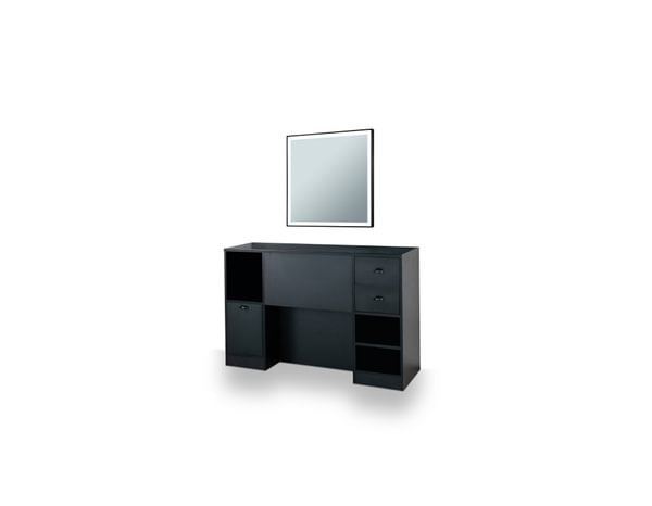 Contém gavetas organizacionais com puxadores metálicos e e espaços abertos com prateleiras de exibição.